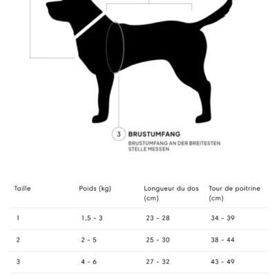 Informations sur les tailles : pour ce modèle, nous vous recommandons de vérifier la longueur du dos de votre chien dans le tableau des tailles. Si votre chien se situe entre deux tailles, nous vous suggérons de choisir la taille la plus grande pour un ajustement plus confortable.